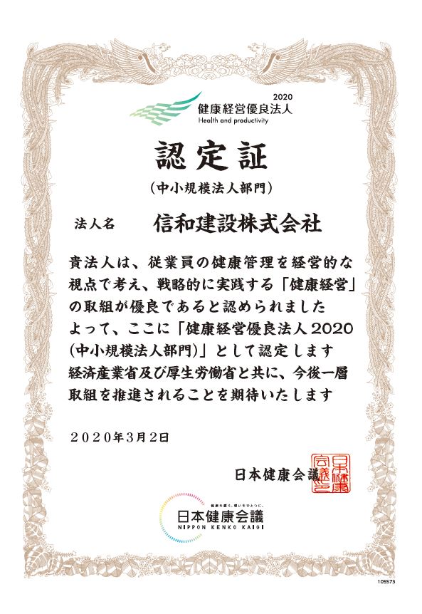 2020.03.02当社が「健康経営優良法人2020(中小規模法人部門)」に認定されました。