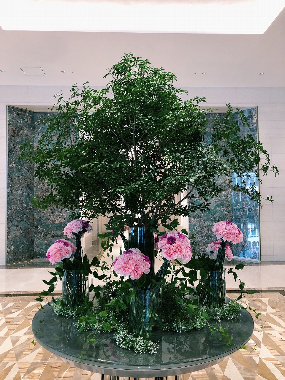 今回は、母の日をコンセプトにカーネーションを使用した、ロビー装花となっております。
