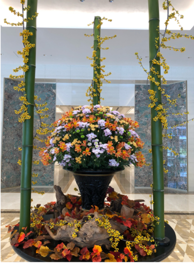 それらに囲まれた空間を中心に秋菊をあしらった丸いオブジェのような花を