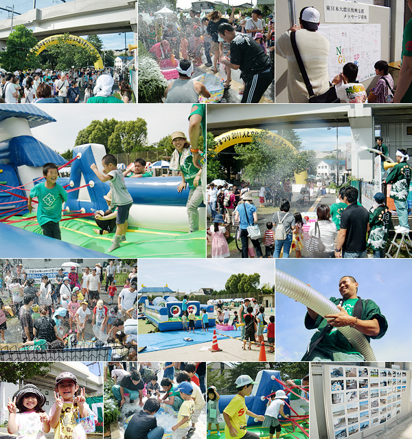 2011.07.278月6日(土)・7日(日)に行われました豊中まつり2011にて被災地写真展、復興支援メッセージ募集、人工降雪イベント 、エアーアスレチック遊具を行いました。