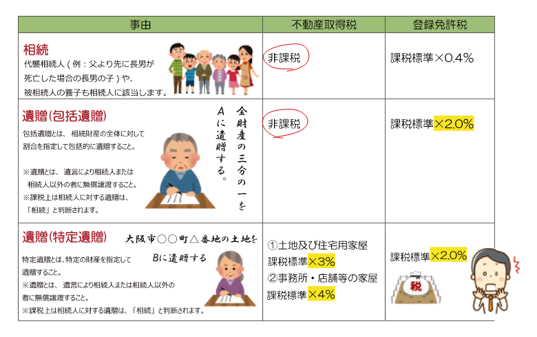 上記のとおり、 誰がどういった事由により取得するかによって、 不動産取得税及び登録免許税の課税関係 が異なります。 例えば、相続人以外の者に不動産を特定遺贈する場合には、 不動産取得税及び登録免許税に課税が生じ、登録免許税は高率(2.0%)の課税となります。これが被相続人の養子となっていれば、不動産取得税は免税となり、 登録免許税は低率(0.4%)の課税となります。 こういった内容に注意して遺言書の作成を行いましょう。