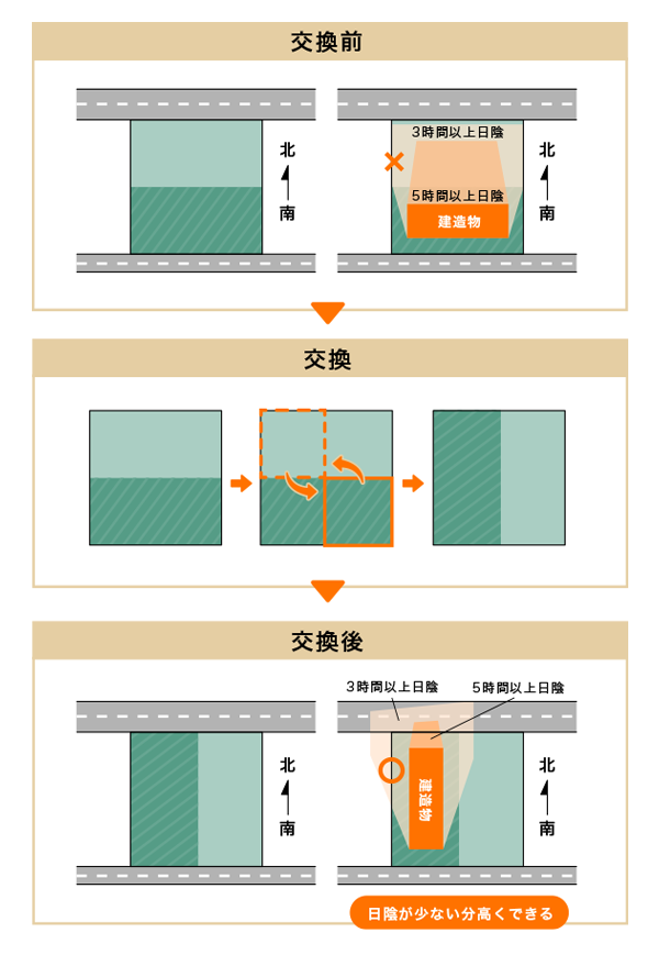 そこで、土地を北側に土地をお持ちの方と交換をする事で、土地の形を南北軸に長い土地に変えました。