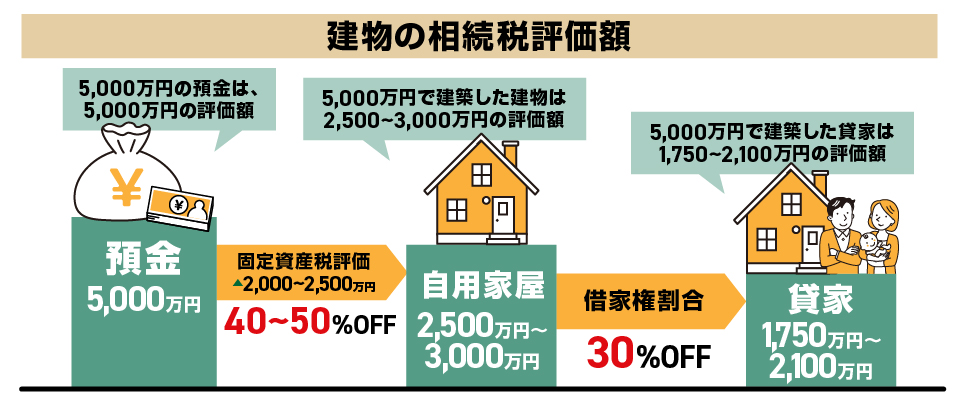 たとえば1億円の資産があるとして、現金で相続するとなると、相続税の軽減効果はありません。ところが、建物5,000万円・土地5,000万円の収益不動産を購入し、賃貸したとすると、相続税の評価は次のようになります。