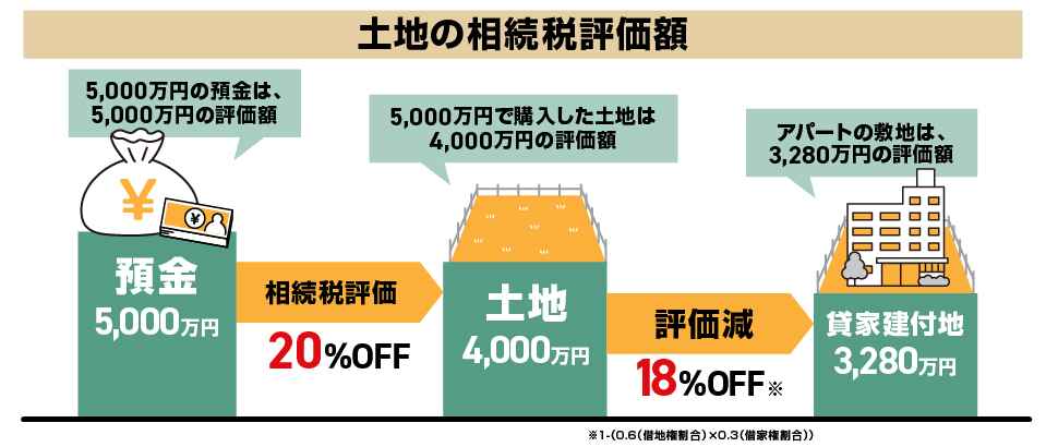 ②土地の評価額=購入価格の約80%=5,000万円×80%=4,000万円。さらに賃貸にするので「貸家建付地」となって、借地権割合×借家権割合が控除できるので、4,000万円×〔1−(0.6×0.3)〕=3,280万円が評価額となります。