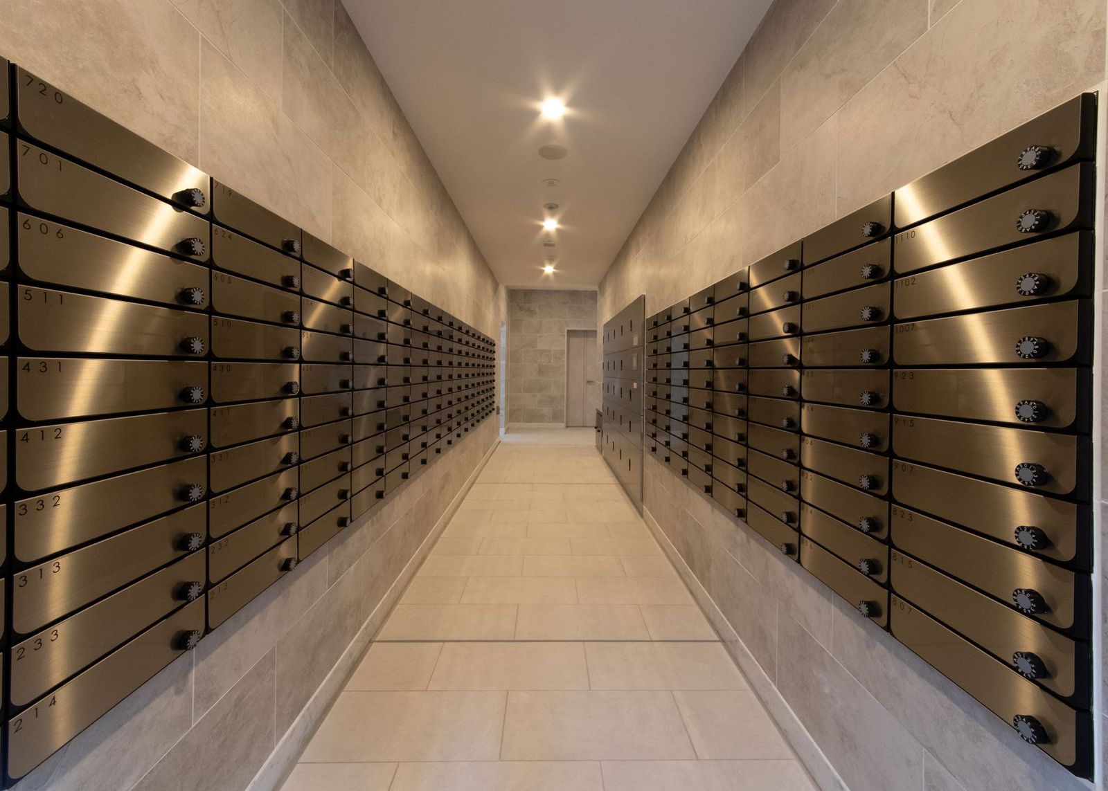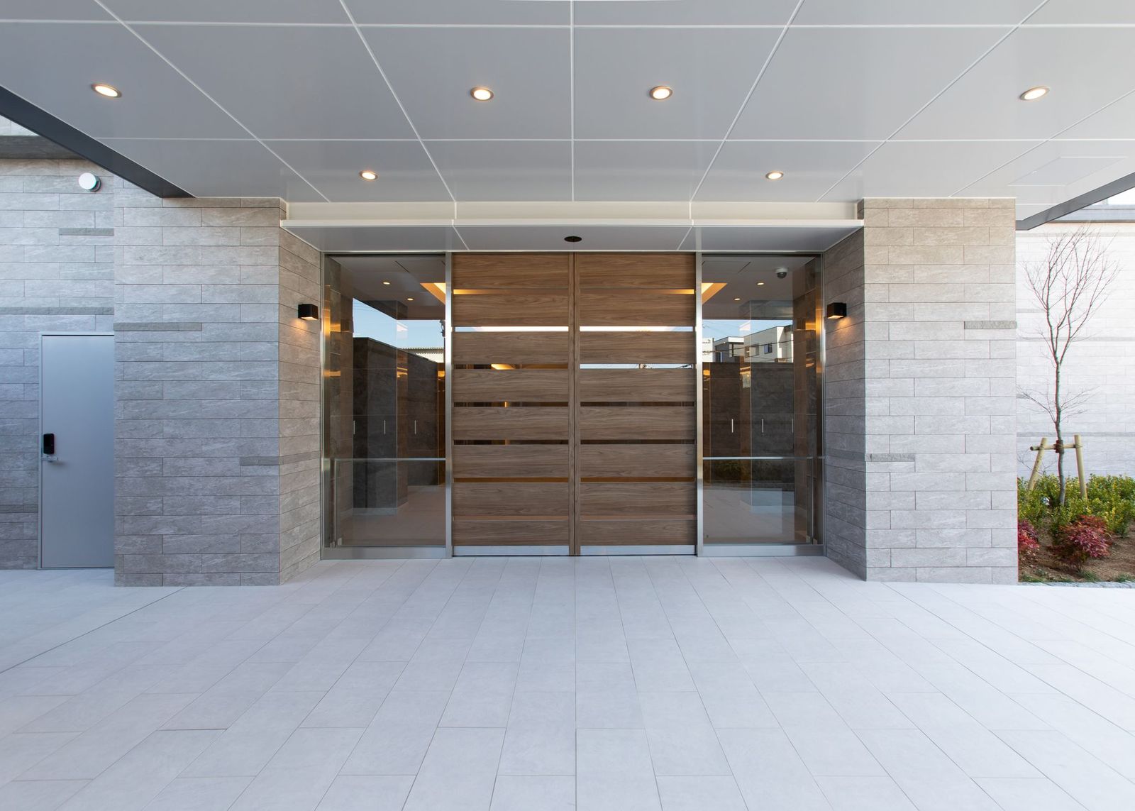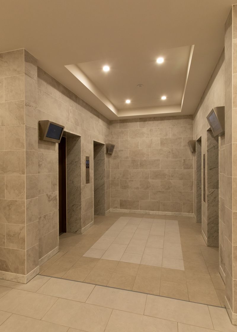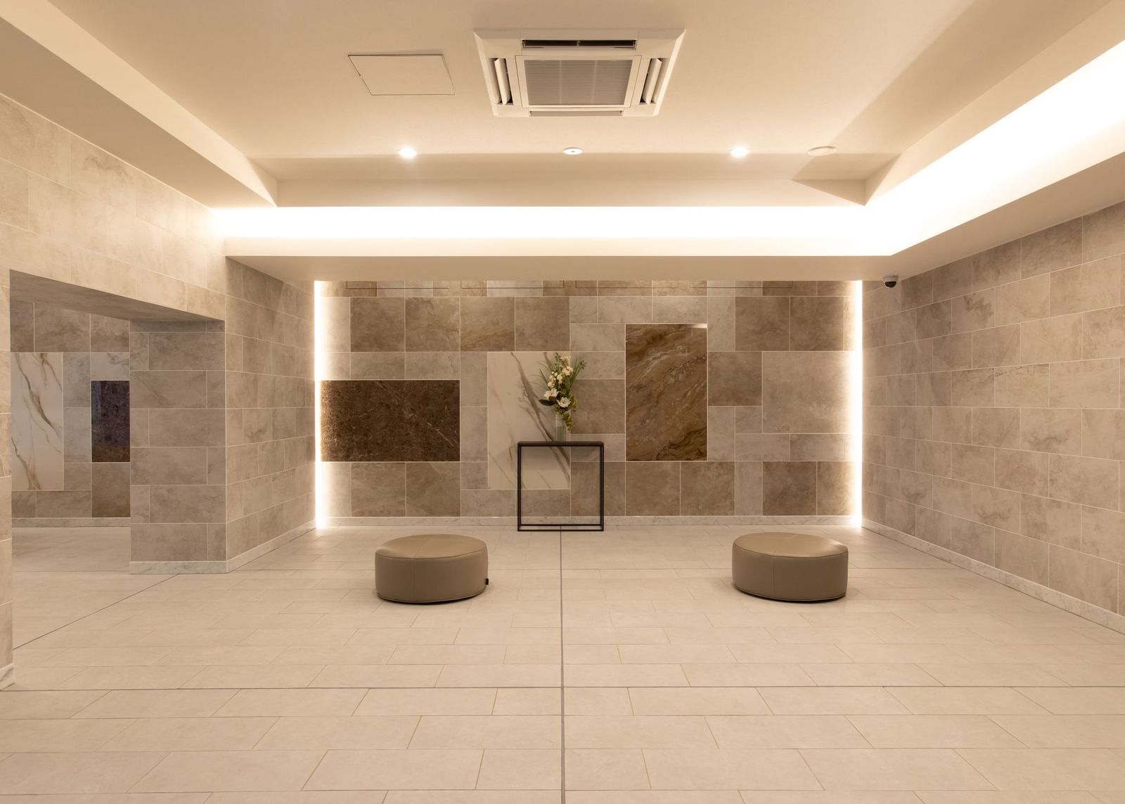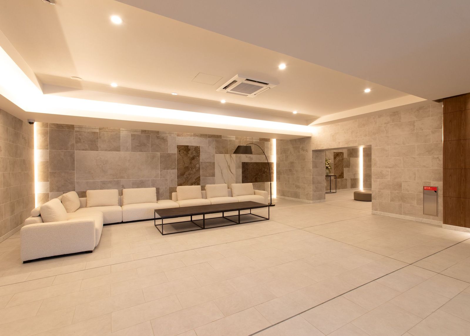 エントランスホールは淡くあたたかみのあるベージュの石材をふんだんに用いることで、明るく、とても落ち着いた印象に仕上げました。複数の大型ソファーを有する大きく広がりのある空間はまるで高級ホテルのロビーの雰囲気で、入居者やゲストを優しく迎えてくれます。