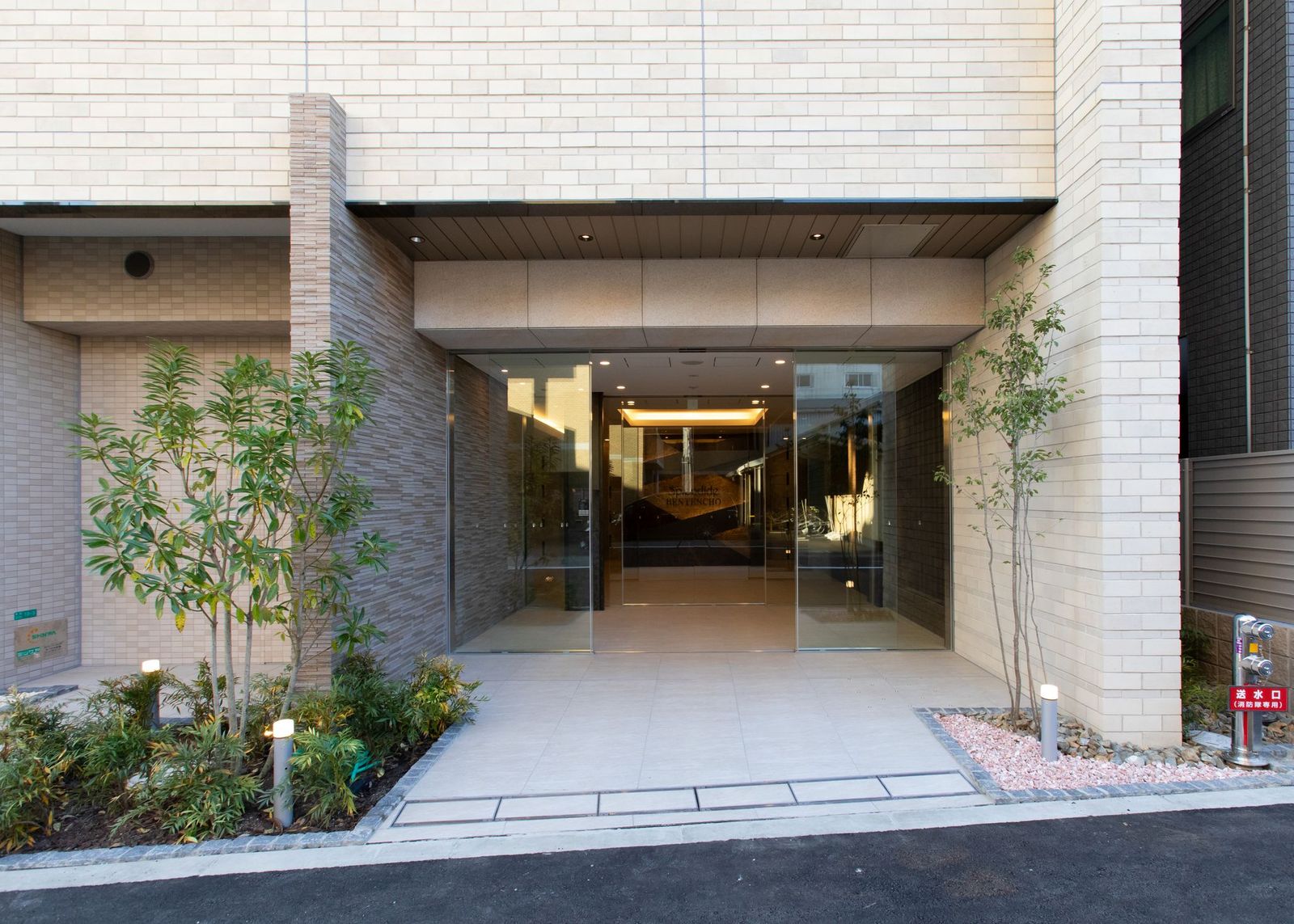 外観は、ベージュ色を基調にしたタイル張りで、ピンポイントのアクセントやグラデーションを活かし、またガラス手摺を部分的に用いることによりスタイリッシュで高級感のある仕上がりとしました。