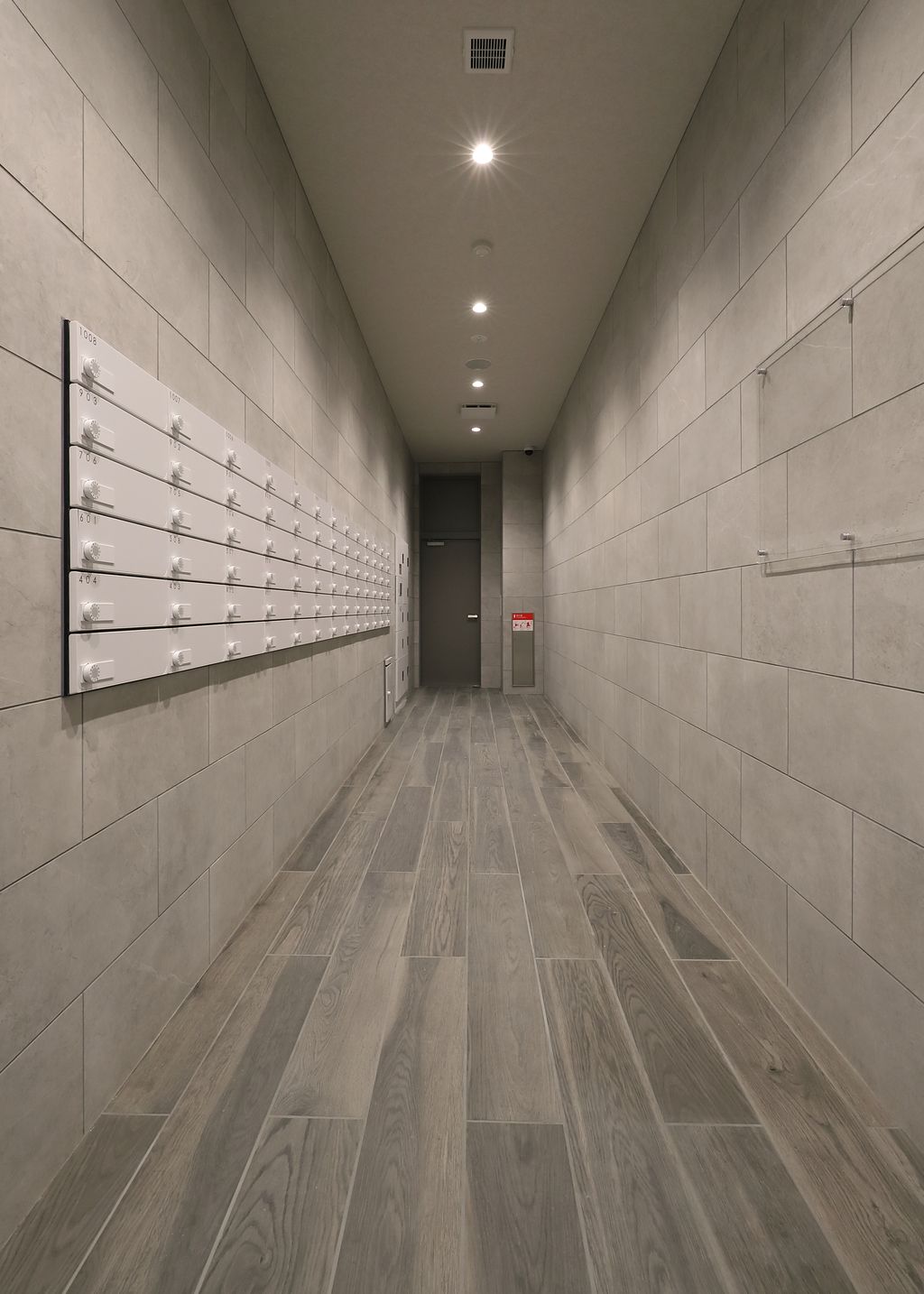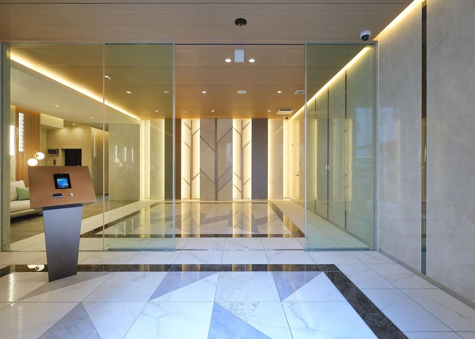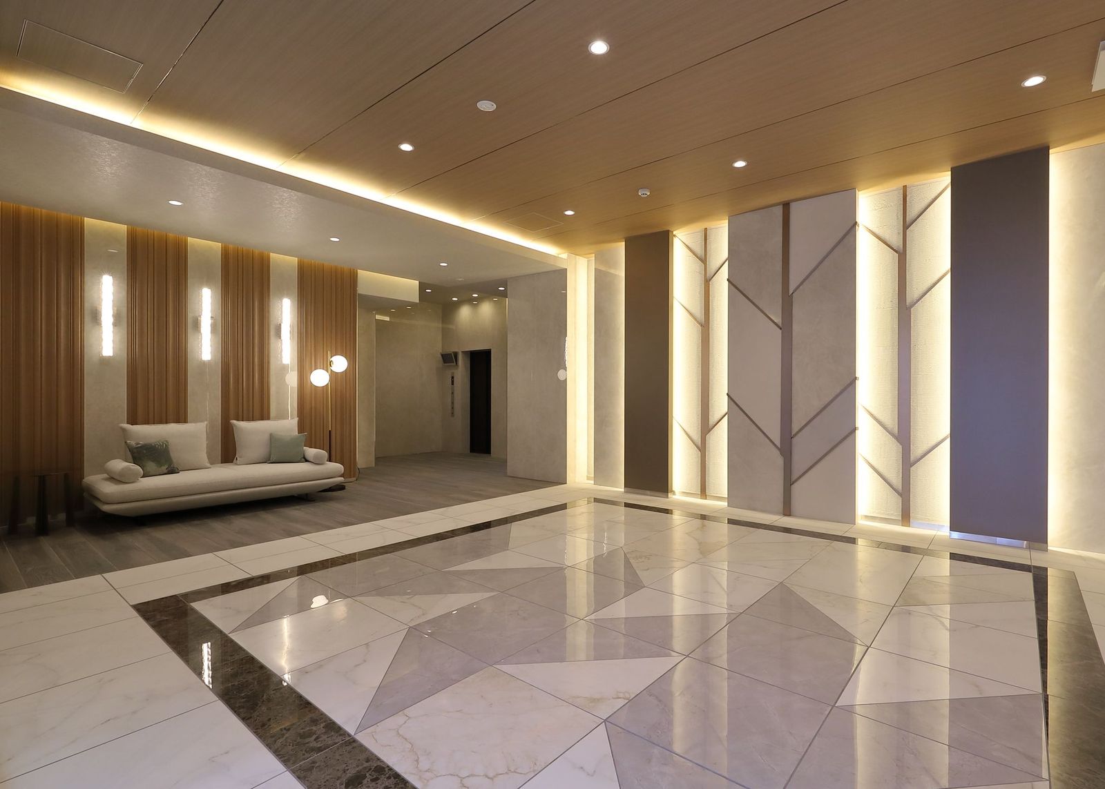 外観は、ベージュ色を基調としたタイル張りの、スタイリッシュで高級感のあるデザインに仕上げました。エントランスは入り口付近に、緑豊かな植栽を施し、こころやすらぐ雰囲気を演出いたしました。エントランスホールにおいては、床部分は石材を用いモダンな幾何学模様を、天井はやわらかい木目調であたたかみのある落ち着いた雰囲気を、また壁の一側面は全面を鏡面とし、開放感があり、とても広がりの感じられるつくりに仕上げました。さらに鍵をお持ちの入居者はエントランスをハンズフリーで自動開錠可能です。