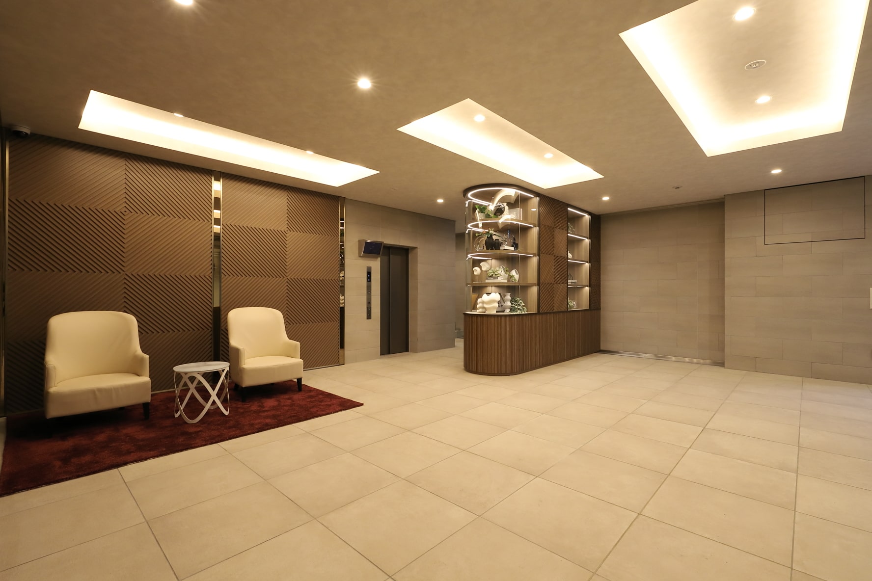外観は、黒と白のコントラストがシャープで都会的な印象を与えます。白色の外壁タイルとベランダのブロンズガラスと2色カラーをランダムに配した横ルーバー手摺が、高級感と洗練された雰囲気を際立たせます。エントランスは、折り上げ天井の間接照明が柔らかな光を生み、落ち着きと高級感を演出しています。