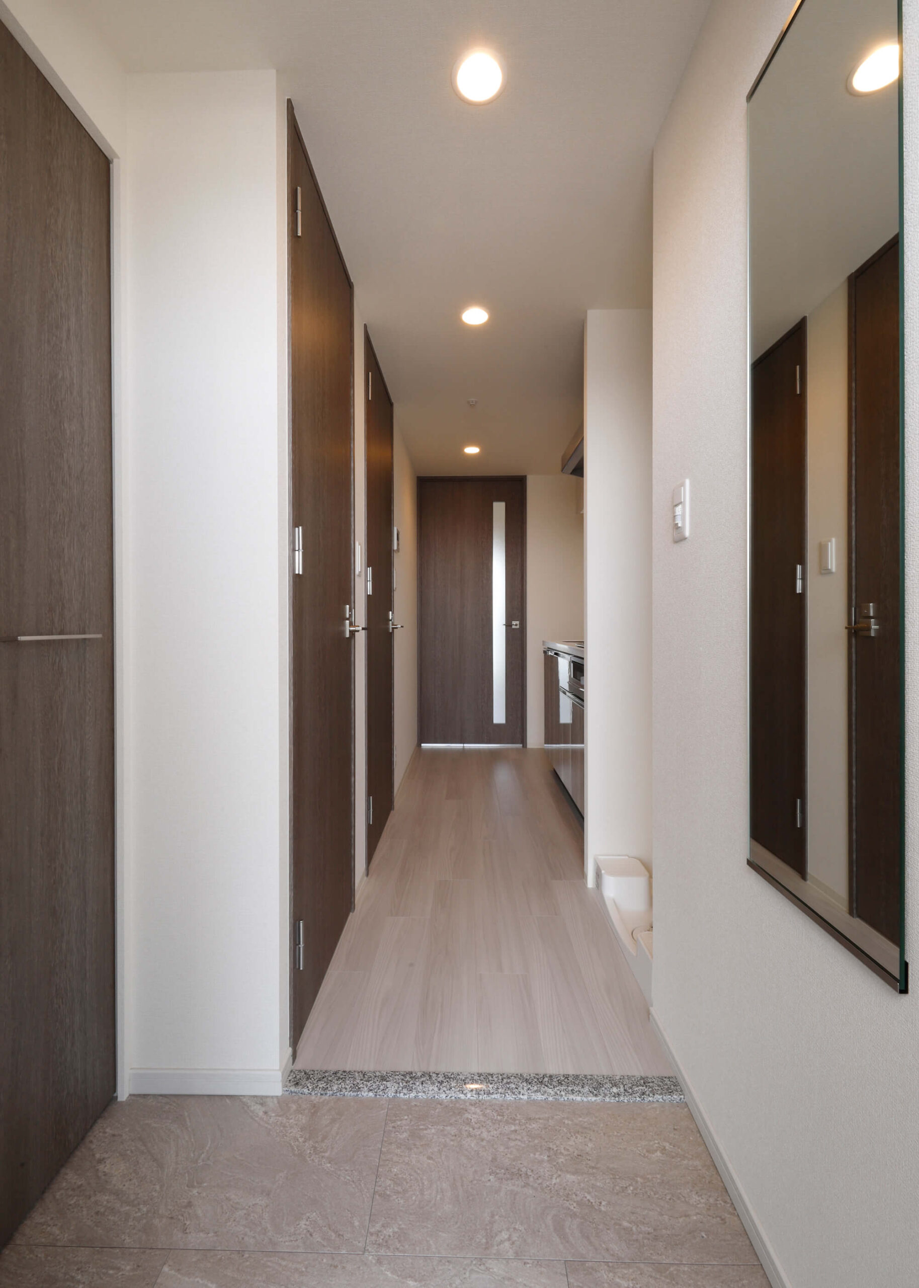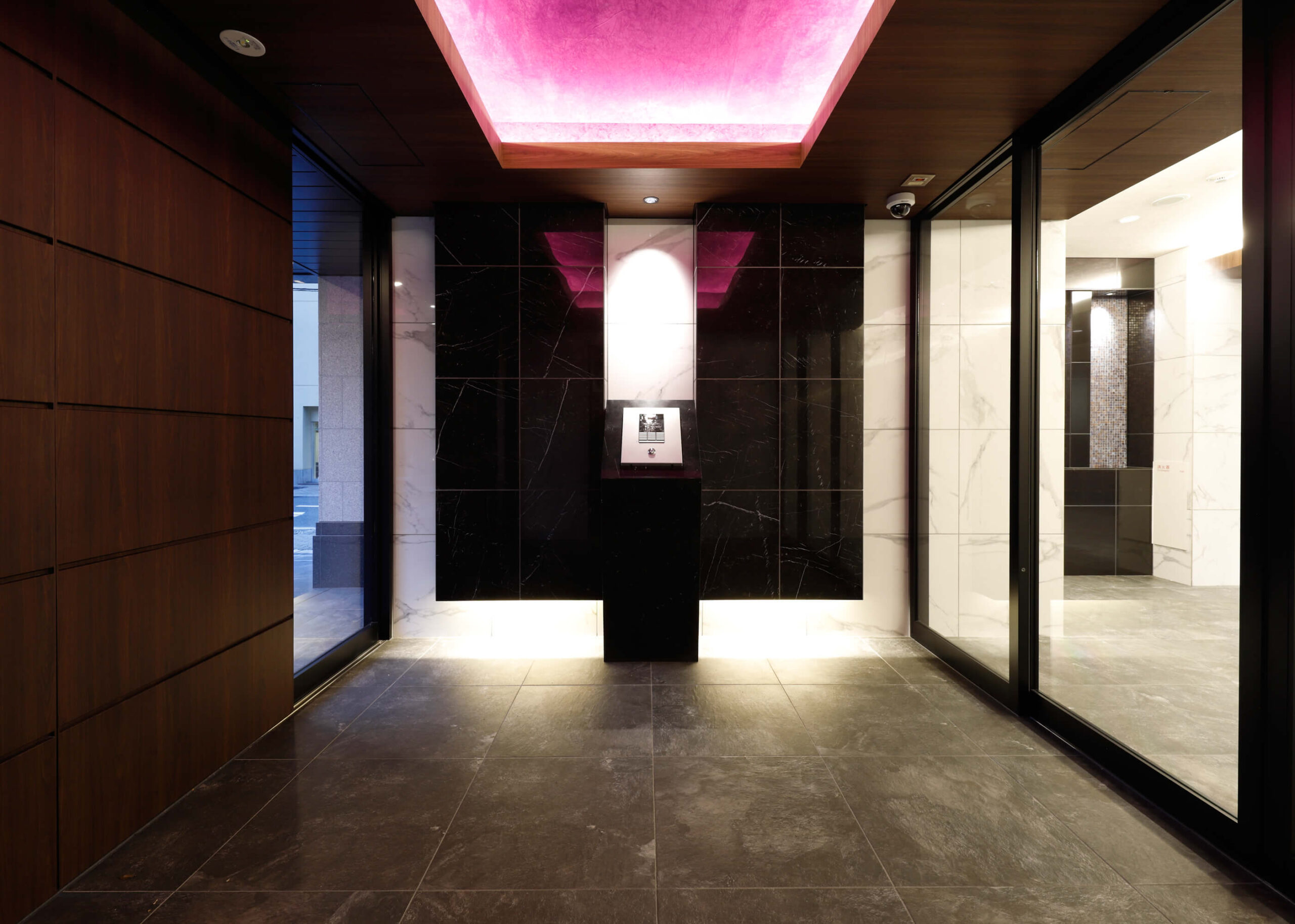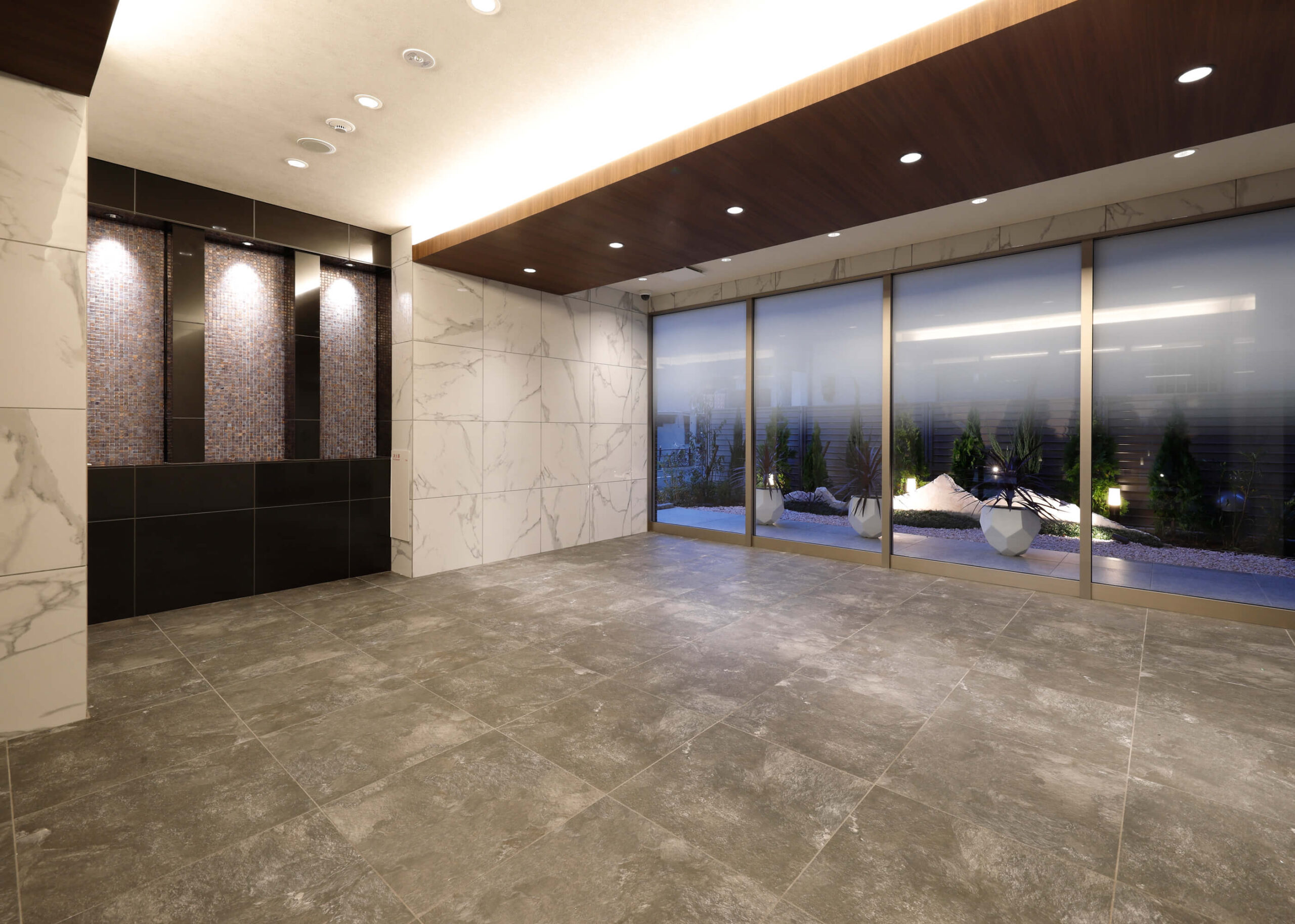 エントランスにはふんだんに石材を用い、上質感のある大理石調の壁とウッド調の天井が高級ホテルのような落ち着いた雰囲気とゴージャスな空間を演出いたしました。