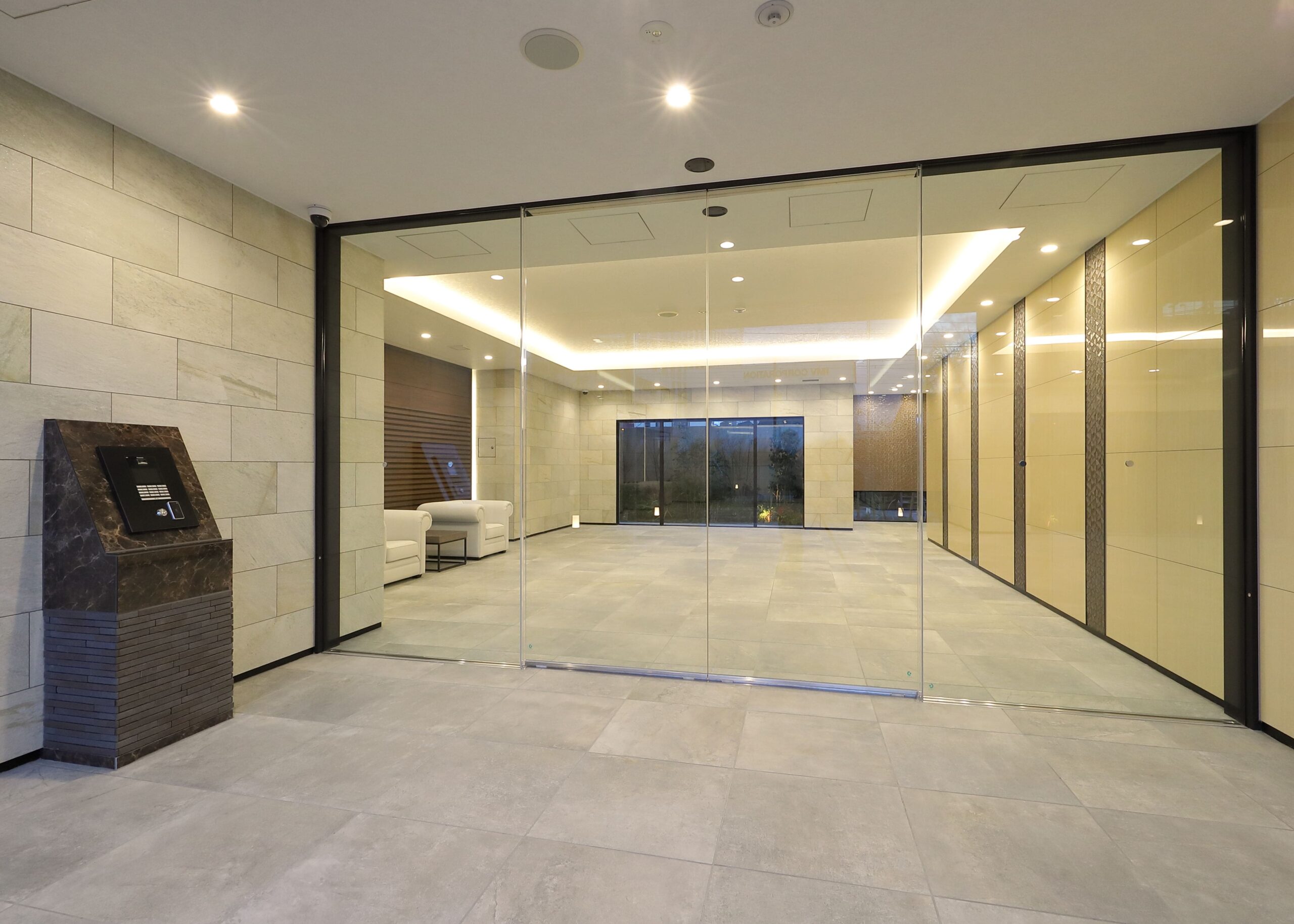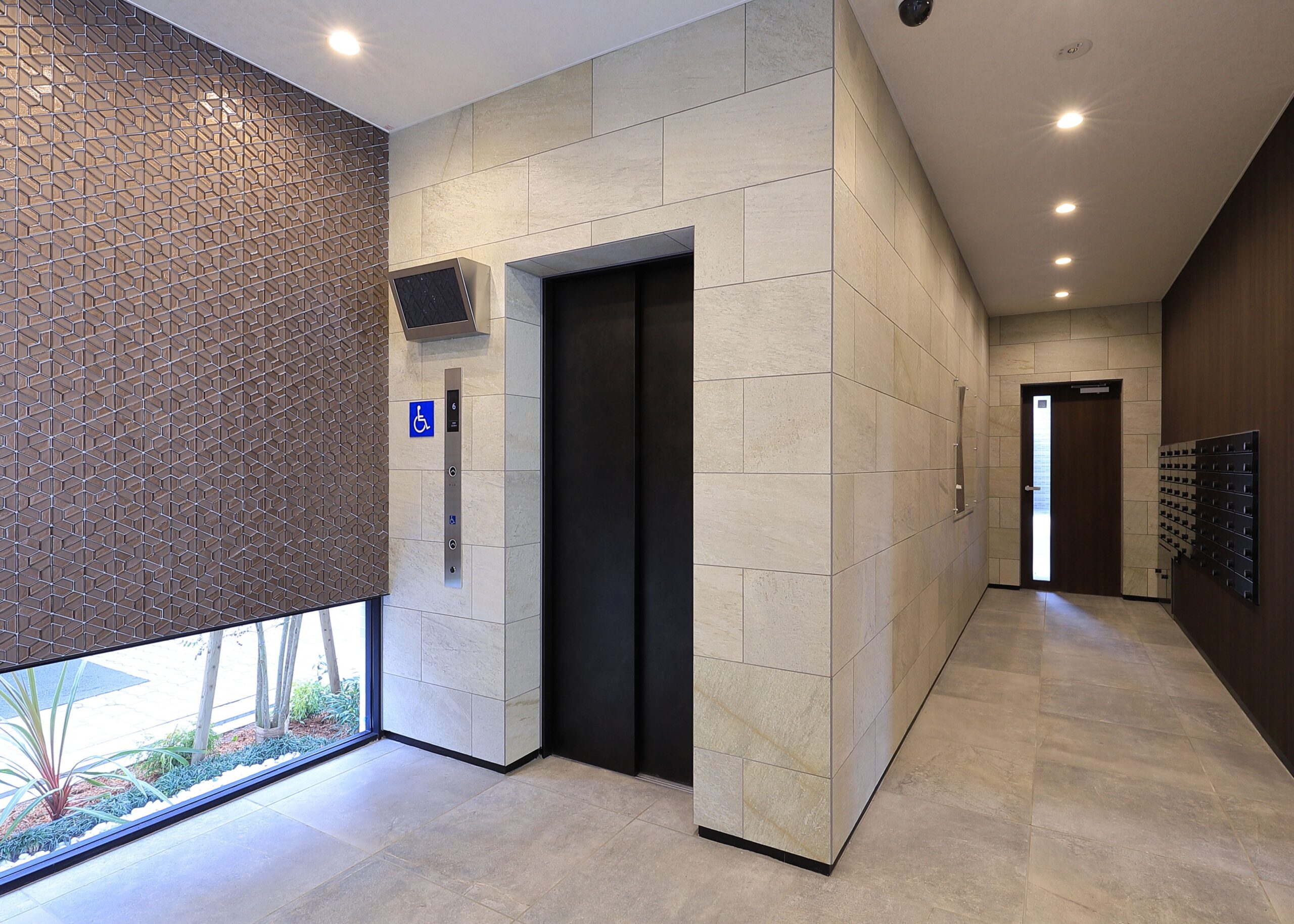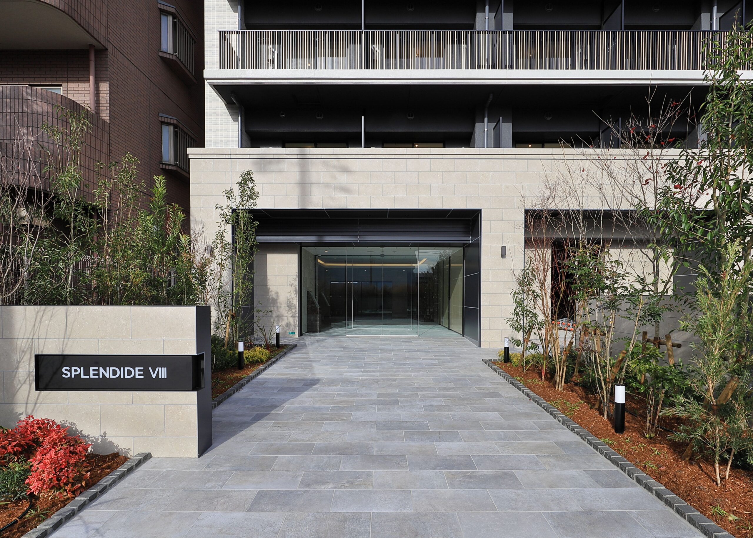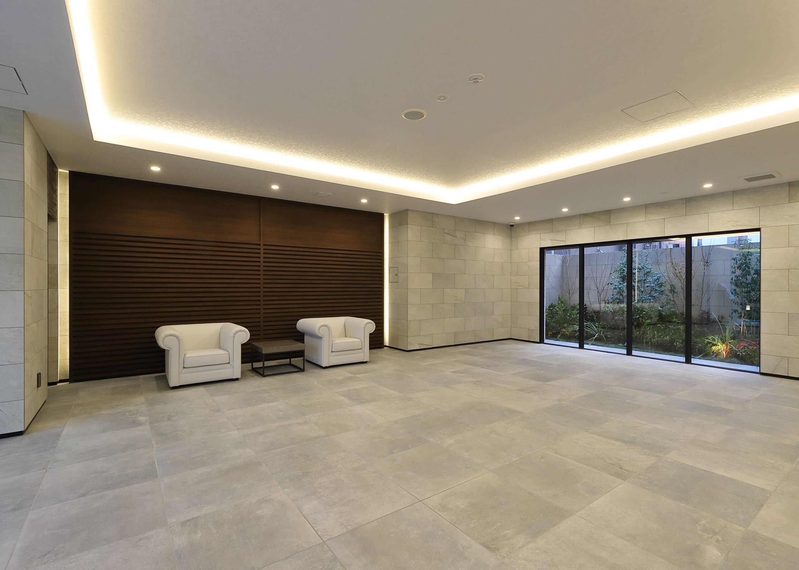 建物外観は、ベージュを基調としたタイル張りをベースに、ガラス手すりと縦型ルーバーがアクセントとして機能し、シンプルかつ高級感あるスタイリッシュなデザインを実現。エントランスとエントランスホールには大判の石材を贅沢に用い、素材と色味のコントラストによって、洗練されたラグジュアリー空間を創出しています。床と壁の連続性や広さにこだわった設計が、まるで1枚の絵画のような統一感ある仕上がりを生み出しています。