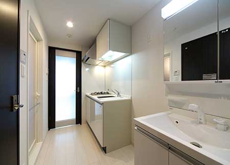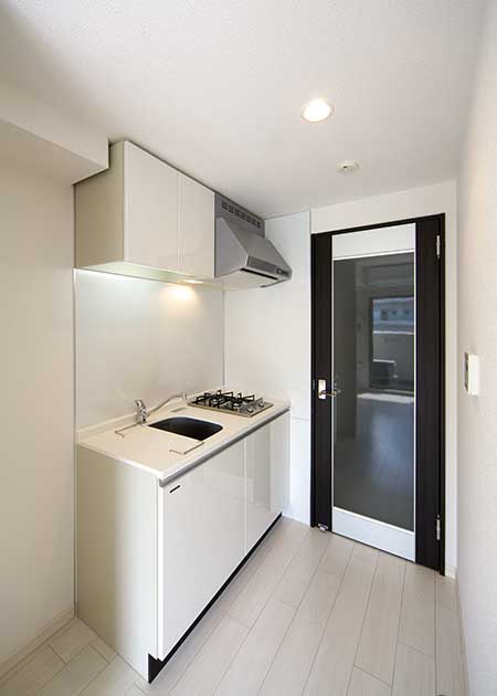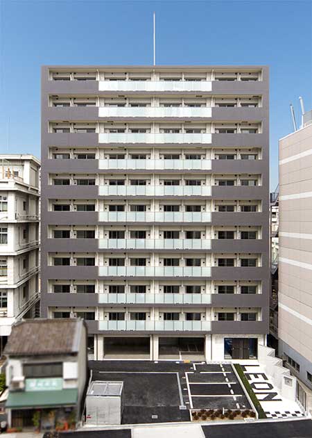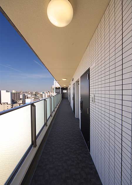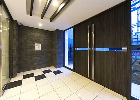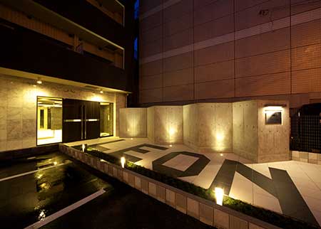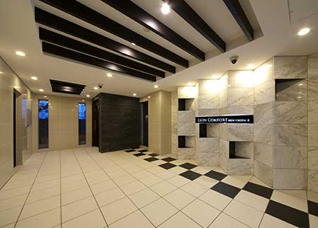 レオンコンフォートマンションシリーズの物件です。外観は白と黒のタイルでまとめられ、エントランスには400画のタイルを使用し、斬新な仕上げとなりました。 外溝ポーチには、白をベースに黒タイルでお客様の社名の一部「LEON」という文字を表現するなど遊び心もユニークです。