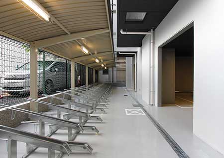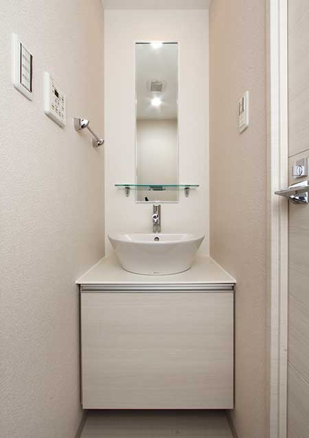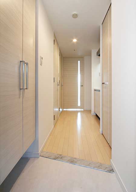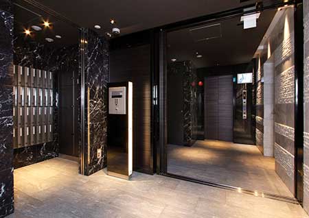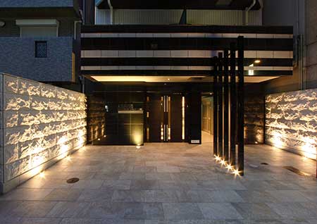 マンションでは、特に外観にこだわり、エントランスから共用廊下まで落ち着いた雰囲気となっています。照明の当たり具合や日中と夜間で、どのように建物が変化するのかなど、入念に打ち合わせを行いました。中でもエントランスにある柱のモチーフに照明が反射し映る様子がとても綺麗です。
