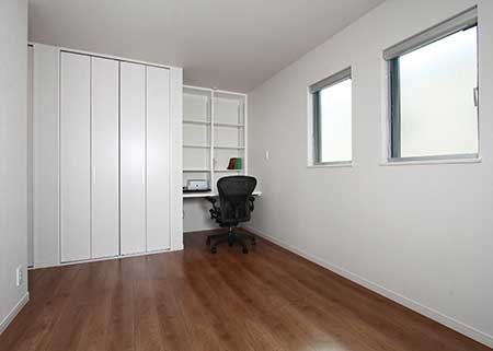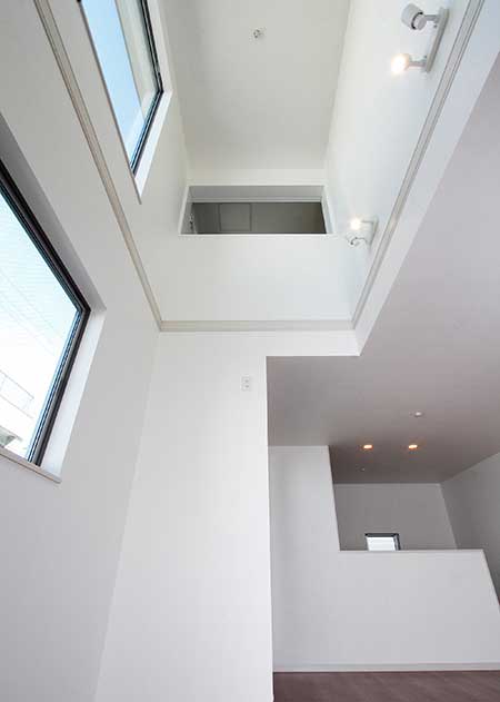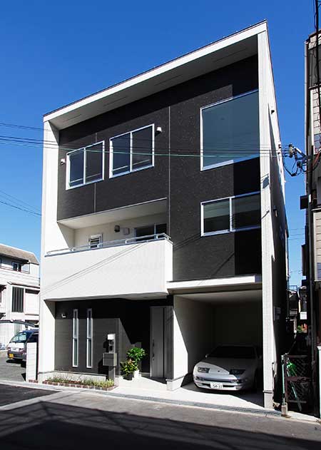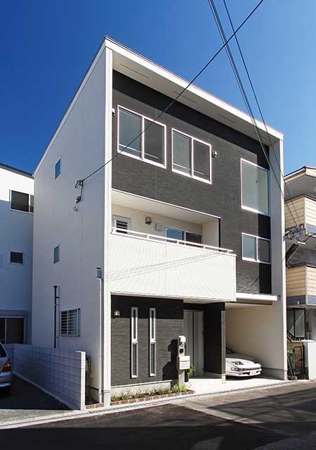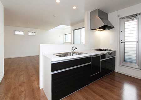 シックな白黒の外観の注文住宅。施主様と設計の先生と打合せを頻繁に行い、細部にまでこだわった仕上がりになりました。2階のリビングは3階まで吹き抜けになっており、3階の大きな窓から光が差し込み、2階のリビングを明るくしています。また3階洋室からは2階の様子が見おろせるようになっています。キッチンから直接バルコニーへ出れるドアを設けたりとおしゃれかつ機能的なご自宅となりました。
