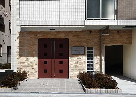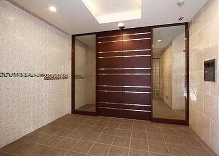 外観は、ベージュ色を基調にしたやわらかい2色使いのタイルに、すりガラス調のルーバーを配することで、シックな装いの中にあたたかみのある上品な雰囲気に仕上げました。エントランスには木とスチールが印象的なスタイリッシュな扉を配し、シンプルに片寄りがちな風除室を華やかな空間に仕上げました。