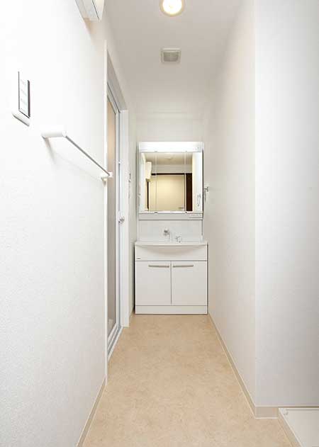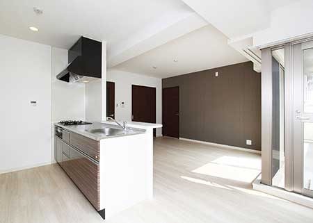 居室は白を基調に板張りの壁を配し、キッチンカウンターは明るくナチュラルなウッド調のデザインを採用しました。南向きのお部屋のため日当たりがよく、日中にお部屋で過ごすことが多い方でも快適にお過ごしいただけます。バルコニーが2部屋に面しているため、風通しも良好です。
