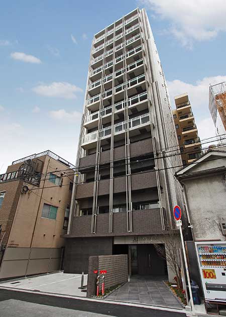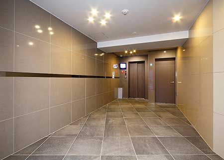 外壁は、縦のラインを特徴とした珍しい貼り方をすることで、細身でスタイリッシュなフォルムをより際立たせております。下層階は濃いベージュ、上層階は薄いベージュとタイルの色を切り替えることで、安定感を創出しました。
