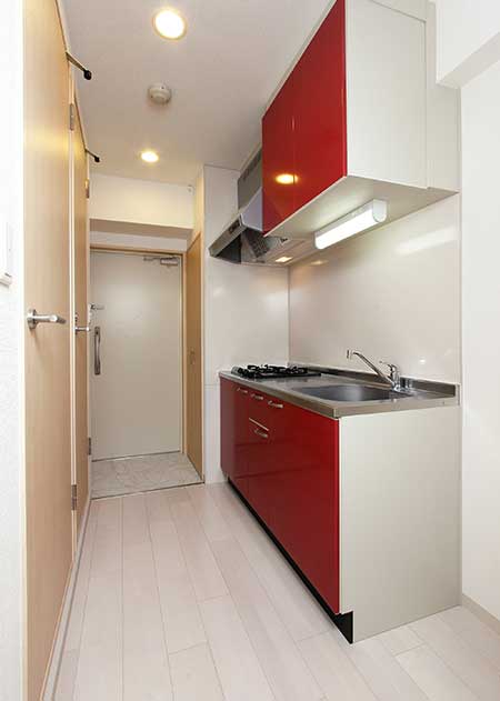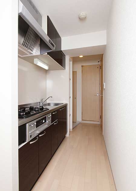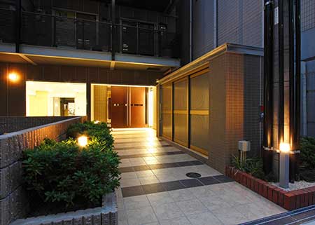 賃貸入居希望者が内見時に最初に目にする、アプローチからエントランスホール内部にかけては、木目調を巧みに使用し落ち着いたアダルトな感じの仕上がりにしています。