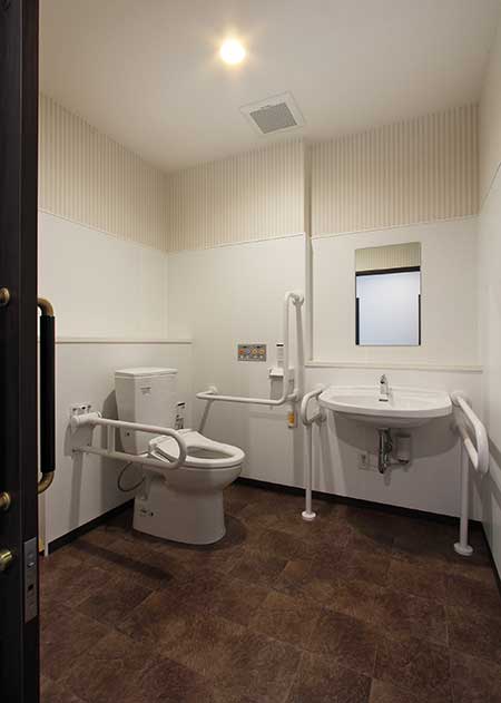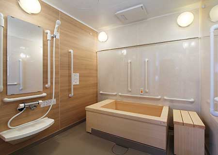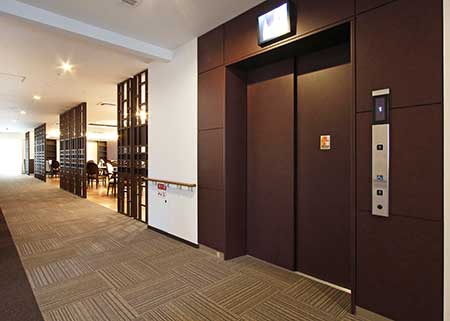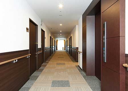 玄関は自動ドア、スロープを採用し、つまずきの原因となる段差を極力取り除き、廊下はバリアフリー完備、施設内のいたるところに手すりを取り付けることで、入居様が安全に安心して移動できるようにしました。