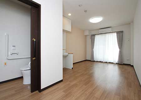 居室は約17平米と広く、収納棚を備え付けているため、介護ベッドや家具類を配置してもゆったりとお過ごしいただけます。また窓とベランダがあり、部屋にいながら日の光や外の空気を楽しむことができます。