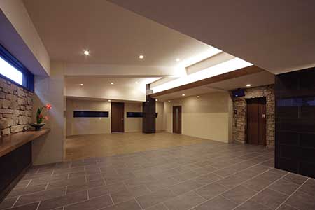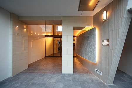 外観は、ベージュ・ホワイト・ブラックの3パターンを絶妙なバランスで使い分け、建物そのものが近代美術のようなスタイリッシュかつ洗練された雰囲気に仕上げました。エントランスは開放感がある吹き抜けを採用し、ガラス張りの扉と暖色系のスポットライトと間接照明があたたかな雰囲気を醸し出し、学生が心地よく出入りできるよう、快適な空間を演出しました。