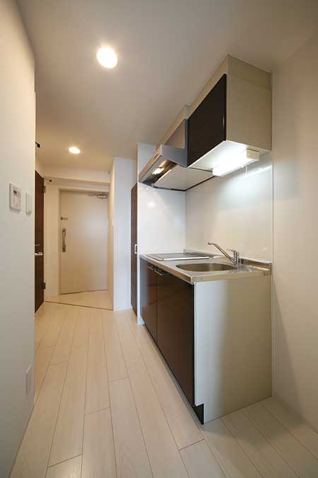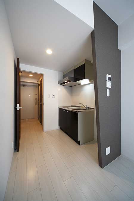 間取りはワンルーム・1Kで、内装はインテリアに合わせやすいよう、明るく清潔感のあるホワイトと落ち着いたブラウンで仕上げています。一人暮らしの学生でも安心して生活していただけるように、オートロックはもちろん、管理会社が24時間出入り口を監視カメラで管理、ダブルロックキーやTVモニタ付きインターホンでセキュリティ面も充実させています。
