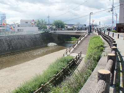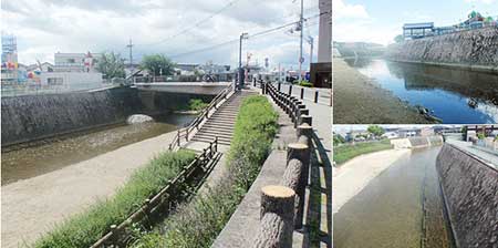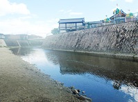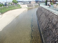 大阪府の工事です。千里川の河川の底を掘削し、幅10m長さ100mの間に、漁礁を設置した工事です。すぐそばには、河川公園、幼稚園があります。数年後には、魚が住み着き憩いの場となるでしょう。