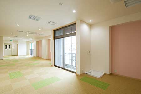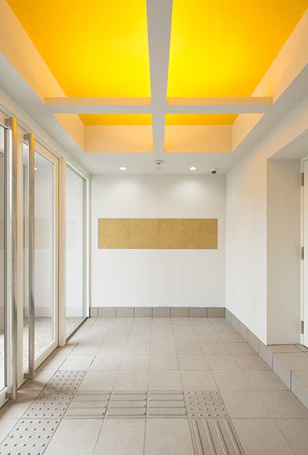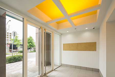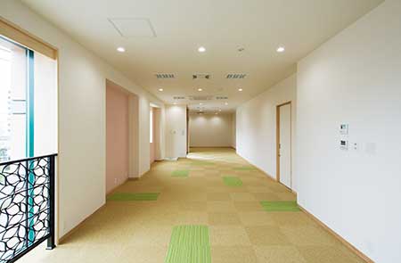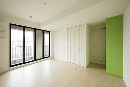 マンションエリアの間取りは単身者が暮らしやすい1Kで、日当たりと眺望に優れた南向きのお部屋をご用意しております。居室内装は清潔感を重視しながら、部屋ごとに異なるテイストを取り入れ、お部屋選びの楽しさを提案しています。収納に便利な備え付けクローゼットも完備しており、7.85〜9.7帖を入居者自身の好み通りに自由自在にレイアウトできます。テナントエリアは、幅広い業種のテナントに対応できるよう、柔らかな色合いとゆとりある廊下設計により、使いやすさを追及しました。