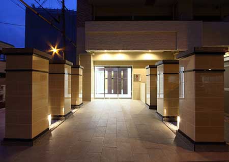 アプローチには重厚感のある柱を6本配置し、高級感ある個性的なデザインとしました。
