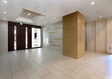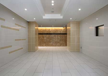 エントランスは白とベージュをメインカラーとし、明るく清潔感のある空間を創出しました。エントランス正面の壁にライン使いしている黒石は、アプローチに使用している柱と同じ石を使うことでアプローチからエントランスまでのつながりを表現すると同時に、アクセントとして映えています。