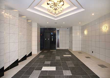 エントランスアプローチは、通りに沿うように、緑豊かな植栽と花壇を配置し、入居者やゲストをあたたかく迎え入れる空間を演出しました。エントランスは黒色のドアでシャープな印象を与えますが、エントランス内はシャンデリアと大理石調の壁、床のモザイクタイル、観葉植物が織りなすゴージャスな空間が広がります。夜になるとアッパーライトが建物と館名盤を照らし、さらに華やかな雰囲気を醸し出します。