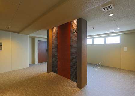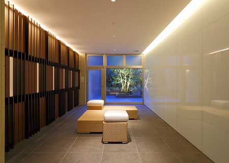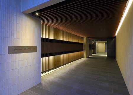 エントランスには最大級のこだわりを詰め込み、ルーバー(羽板と呼ばれる細長い板を、枠組みに隙間をあけて平行に組んだもの)の支持金物をなるべく見えないように配置することで間接照明の陰影を綺麗に表現し、柔らかな空間を創出、板と板の間から照明が光を放ち、来訪者を魅了するおしゃれな空間が広がっています。