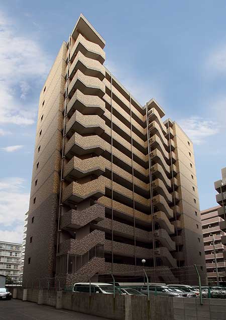 マンション外観は、茶系のタイルで濃淡をつけてながら、下階をより濃色の茶色にしたことでどっしりと印象を与える外観となっています。