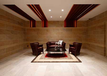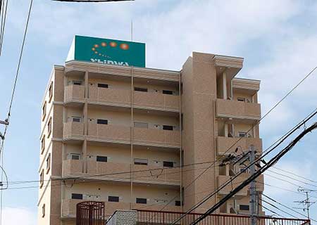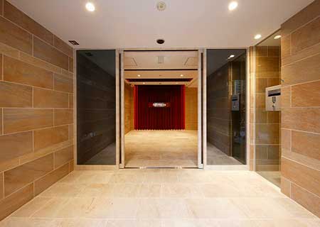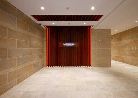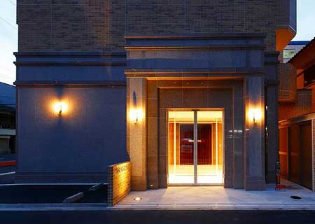 外観はベージュを基調としたタイル張りで、ナチュラルでスタイリッシュなデザインに仕上げました。エントランスは単身者からファミリー世帯まで受け入れられるデザインで、正面奥の館名盤がある壁には間接照明をアクセントに加え、ナチュラルかつお洒落な空間を演出しています。待合室の天井にはソファーと同色のアルミルーバーをライン使いし、モダンな迎賓空間を提供しています。