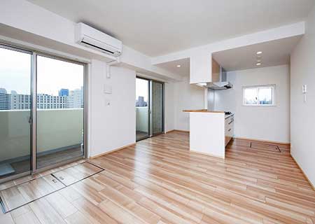 8階から10階はルネス工法を採用、ルネス工法によって生まれた大容量の床下収納は、荷物が多くなりがちな複数人入居の方、ファミリー世帯でも居室内の空間がすっきりと整理され、広がりとゆとりのある空間の実現が可能です。