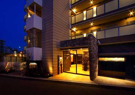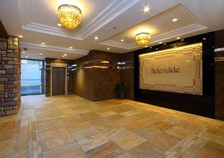 エントランス内部は、擬石タイル、シャンデリア風の照明や壁面オブジェ、効果的なライティングを組み合わせ、分譲マンションのような豪華さを演出しています。