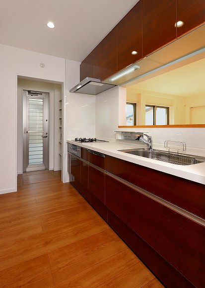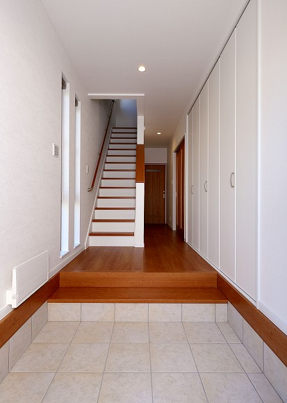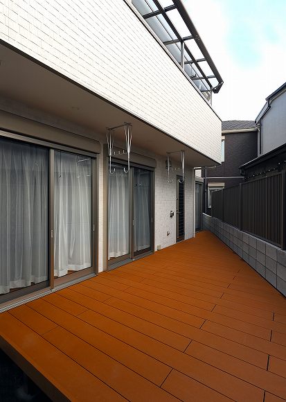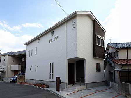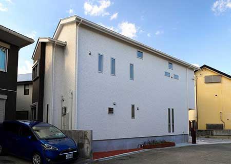 木造2階建て戸建ての注文住宅です。 大阪府豊中市の閑静な住宅街に位置します。 こちらの敷地は変形地でしたが、オーナー様のご要望は3点、 まず、敷地を最大限有効利用すること、次に収納力、そして耐震に強い住宅を建ててほしいとのことでした。 上記のご要望を踏まえて、敷地の有効利用については、変形地を上手く利用して1階のリビングの延長線上に大きなウッドデッキを配置、 収納力については、各階の収納と更に屋根裏にも収納スペースが設けられ、かなりの大容量となりました。 耐震性については、今回1階リビングに大きな開口部を設けていますので、耐力壁を二重壁にして耐震等級を取得しています。 その他、オーナー様のご要望から、将来の介護の為に、1階納戸の中にあるウォークインクローゼットをトイレに変更できるよう床下に先行して配管をいれています。 外壁は、【フュージェ】という外壁材を採用しました。こちらは、「マイクロガード仕様」という特徴があるのですが、空気中の水分子を取り込んで外壁表面に薄い水分子膜を作り、汚れの元となる物質を水分子膜の上に付着させます。雨が降れば、汚れは雨とともに洗い流され、外壁はいつもスッキリ綺麗に保つことが出来ます。 外観もそして内装も、将来を見据え、長く快適に住める住宅に仕上がりました。