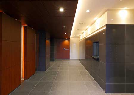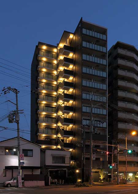 外観はブラックを基調とし、5階以上にはすりガラス調のバルコニーを採用することで、重厚感と高級感のある印象を創出しました。外壁は上質な素材感と耐久性に優れたタイル張り、そしてコンクリート壁内部は断熱材の多層構造で省エネに貢献する仕様とし、資産価値の長期維持を図りました。アプローチには豊富な植栽と温かみのあるライティングを施し、エントランス内部はブラックと木目ブラウンを基調とすることで、落ち着いた雰囲気に仕上げました。敷地に接道が1面のみ、かつ接道面に横断歩道があるため、マンション建築中は、資材の搬入やコンクリートの打設に苦労しましたが、工事業者の方や近隣の方々のご協力と関係各所との積極的なコミュニケーションのおかげで、事故もなくスムーズに竣工することができました。