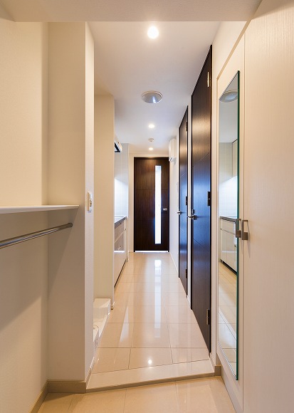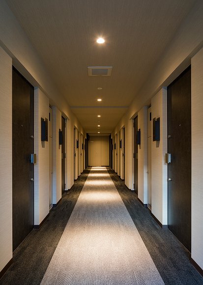 共用部の廊下は内廊下とし、壁はクロス貼り、床はカーペット、照明の明るさを低くすることで、落ち着いたホテルのような空間に仕上げました。