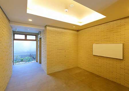 エントランス周辺も細部までこだわって設計・施工しています。特にエントランスには、3種類のタイル仕上げや石貼りを施し、表情豊かな壁に仕上げました。エントランスアプローチには緑豊かな草木を並べ、日々の生活に心地よい安らぎをもたらす空間を提供しています。