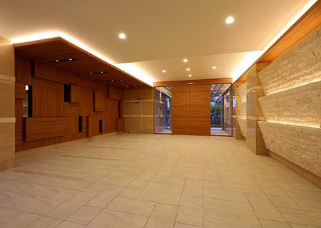 外観は、高級感とともに全体的に落ち着いた飽きのこない雰囲気づくりを目指し、外壁の石やタイル、吹きつけの色を温かみのある色に仕上げました。外構の植栽は色とりどりで四季を感じられる配置にし、建物全体に自然な調和をもたらします。エントランスは間接照明とダウンライトが心地よいあかりを灯し、温かさとモダンな雰囲気を演出しました。