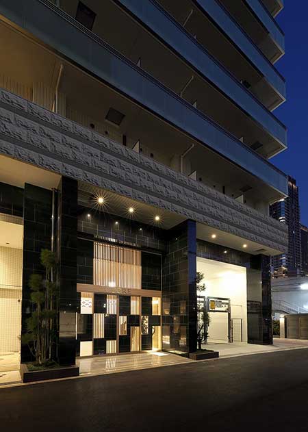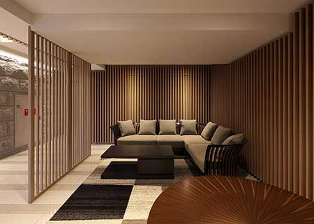 エントランスは、オーナー様のご意向を反映し、木の温もりが感じられる和風に造り、扉を開ける瞬間から落ちついた空間が広がります。木の質感が調和した床や柱は、日本の伝統的な美意識を感じさせ、同時にモダンで洗練された雰囲気も漂っています。植栽にはオーナー様が受け継がれてきた石や植木を配置し、入居者様が四季折々の美しい風景を楽しめるよう工夫しました。