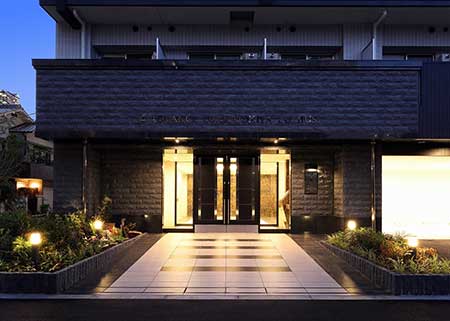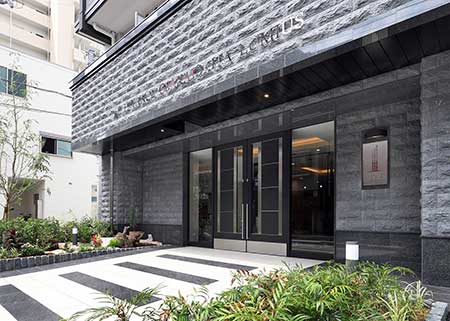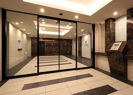 エントランスに入って正面はガラス張りで、開放感を演出しています。夜には、エントランス入り口を優しい灯りが照らし、植栽の緑とともに癒しの道を作ってくれます。