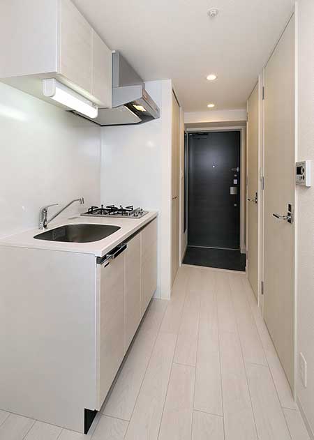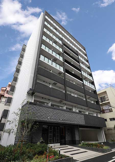 建物は鉄筋コンクリート造、地上10階建ての72戸、外観が黒と白のタイル張りで、上品で落ち着きのあるデザインとなっております。間取りは全室1Kのシングルタイプです。