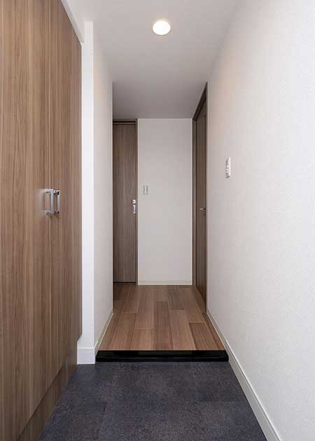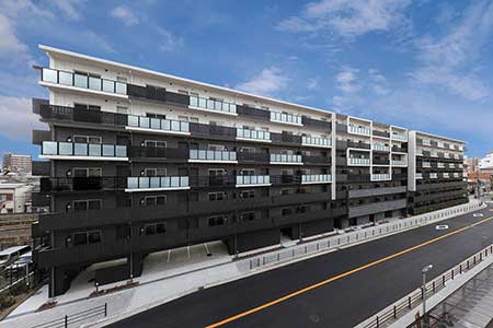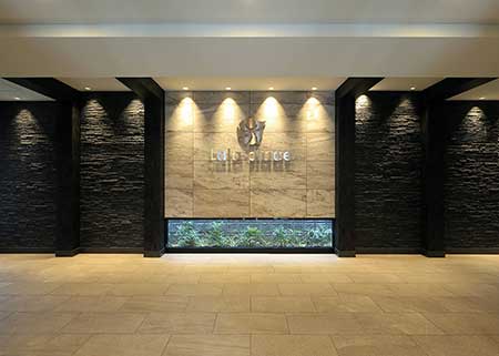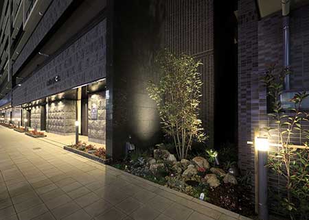 外観はアイボリーと黒で、材質の異なる手摺がスタイリッシュな印象です。エントランスは御影石調のタイルに金属製の館名サインと半月形の外灯を用い、周辺の景観へ溶け込みながら、浮かび上がる濃淡が高級感を感じさせます。広々としたロビーは大理石調に中庭風の小窓を配し、ハイグレードかつナチュラルな雰囲気があります。建物1階には駐車場、駐輪場を配し、様々な通勤、通学スタイルに対応しています。