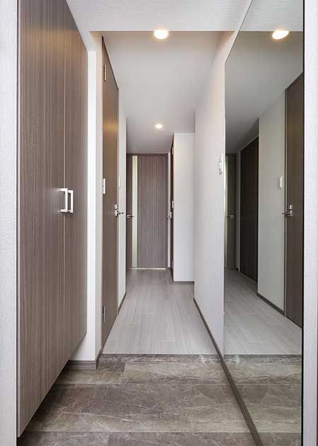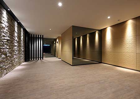 割石、木目壁、ブラックミラーといった様々な仕上げ材を組み合わせ、照明を巧みに配した空間は、陰影や立体感が際立ち、賃貸マンションとは思えないほどの高級感を演出することで高い入居率を目指しました。