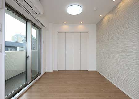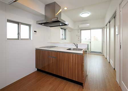 また、入居者が落ち着いた生活が送れるようインテリアにも配慮、各住戸専有部分の建具には無垢材を使用するとともに、キッチン・フローリングには建具に合わせた柄を採用して、木の温もりを感じられるまとまりのあるデザインに仕上げました。