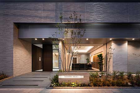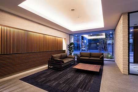 外観は清潔感のあるアイボリーのタイル張りです。玄関をくぐり館内へ入ると、落ち着きのあるホールが広がり、カウチとローテーブルが設置され、来訪者や居住者をさわやかに受け入れます。玄関周りには植栽をバランス良く配置し、高級感を醸し出しています。