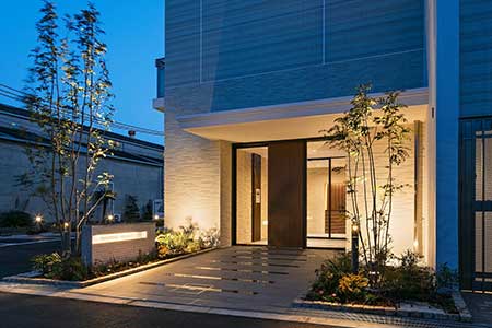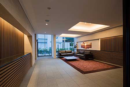 エントランスには白い自然石を配した植栽をしつらえ、ロビーは壁面に木製ルーバーを配したことで、まるでリゾートホテルのような雰囲気を醸しております。