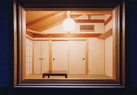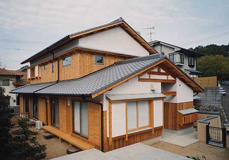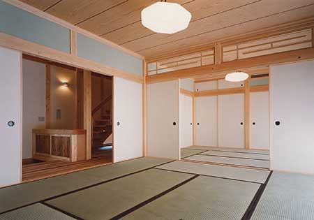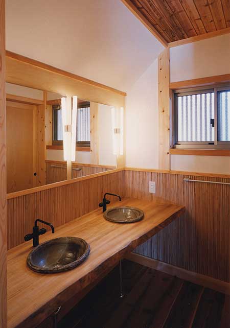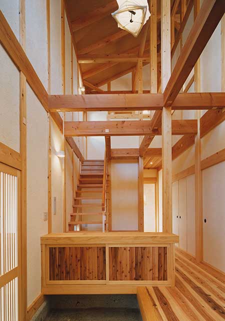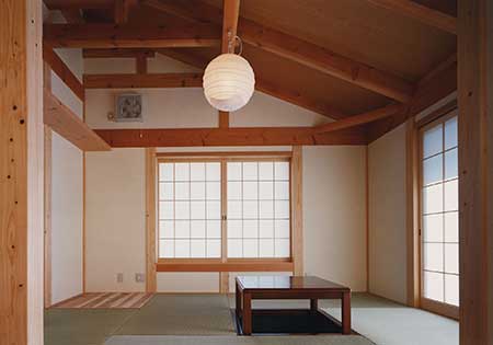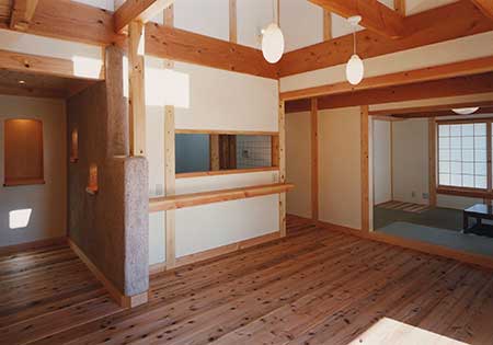 天井がなく吹抜の建物、外部に杉板を貼り珪藻土で体に良い壁材を使用しています。