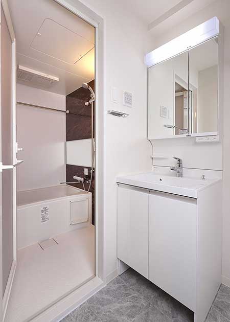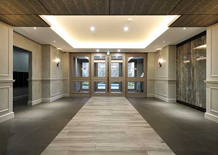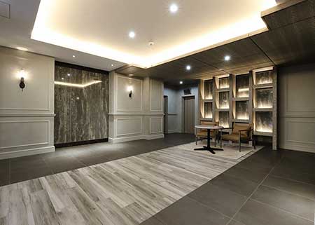 エントランスはニューヨークモダンで統一し、シックな中にもモダンな印象を受ける高級ホテルのようなデザインにしました。エントランスホールはグレー調で統一し、ストーン調のタイルと格子を含んだグラフィカルな壁面照明が芸術的で先進的な印象をもたらしています。